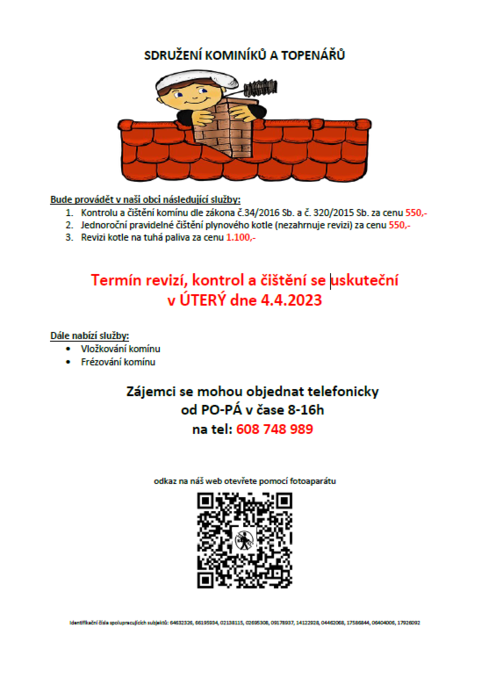 Bude provádět v naší obci v ÚTERÝ dne 4.4. požadované kontroly a čištění komínů dle zákonu č. 34/2016 Sb. za 550 Kč, čištění plynových kotlů za 550 Kč a revize kotlů na tuhá paliva za 1.100 Kč. Dále nabízí vložkování, frézování komínu.