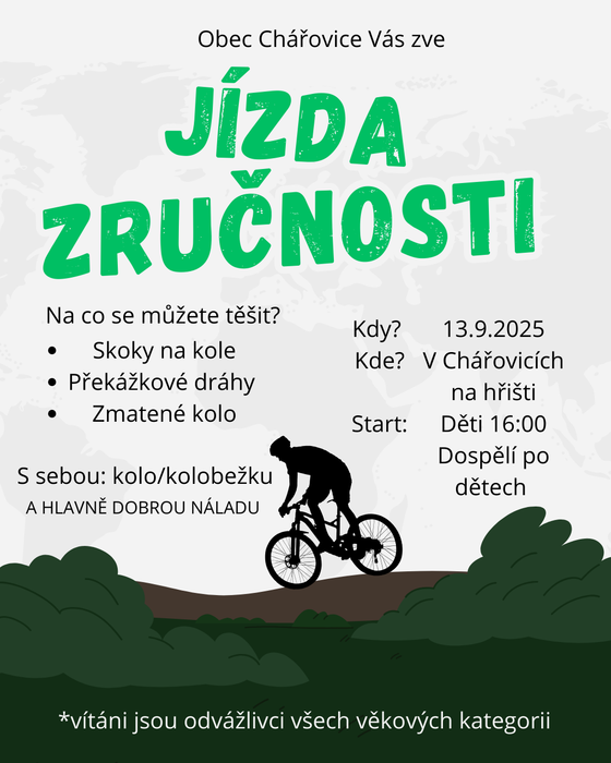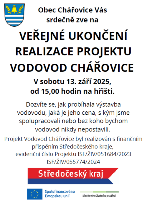 Obec Chářovice Vás zve na oslavu zprovoznění vodovodu, která se koná v sobotu 13.9. na hřišti od 15,00 hodin. Dále bude následovat pro zájemce z řad dětí, ale i dospělých, jízda zručnosti na kole/koloběžce a volná zábava.
